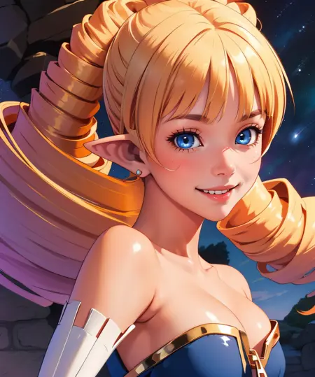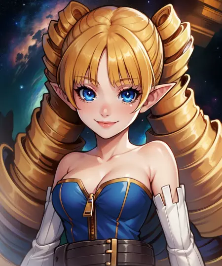 Archer, blue eyes,blonde hair, bangs, twin drill hair, pointy ears,