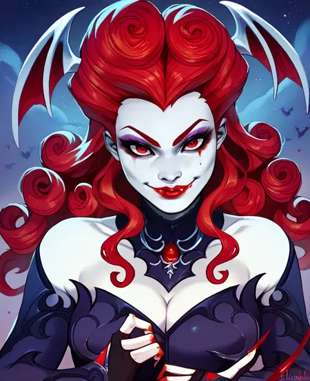 Lillith、赤いカールヘア、頭部の翼、赤い目、化粧
