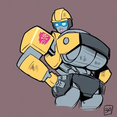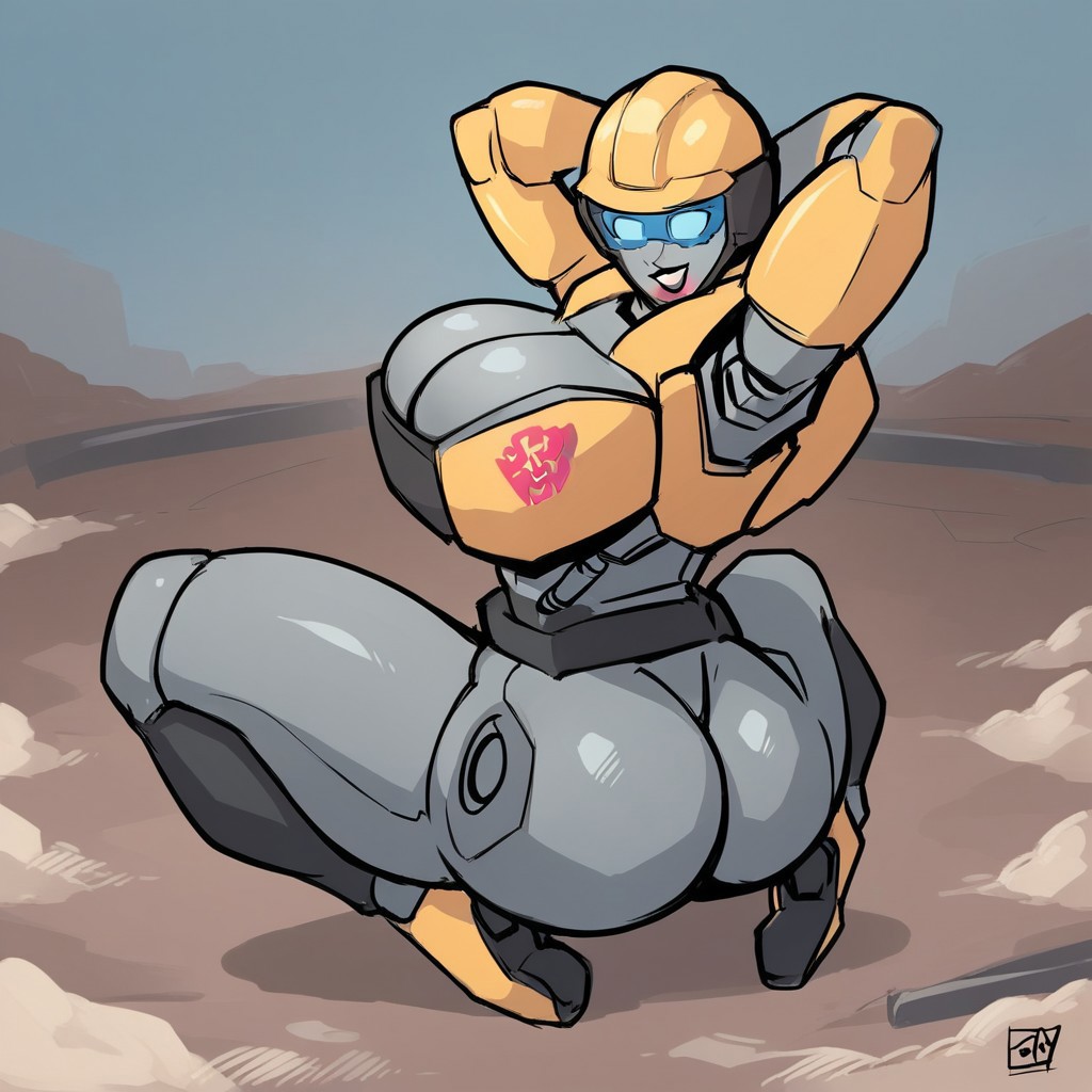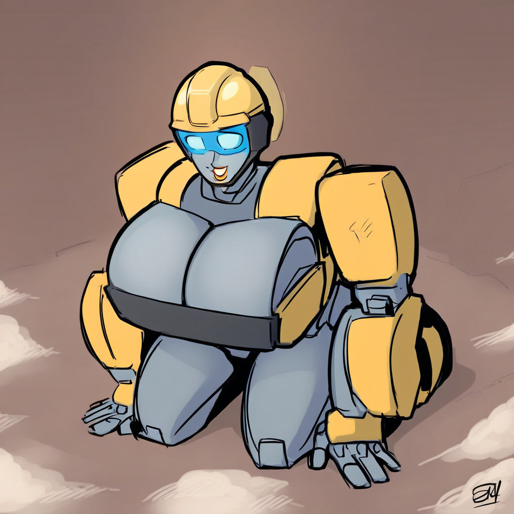 Road roller, transformer, robot, giant, big boobs, female, grey body, yellow armour plates, construction helmet, no pupils, Autobots logo on shoulder