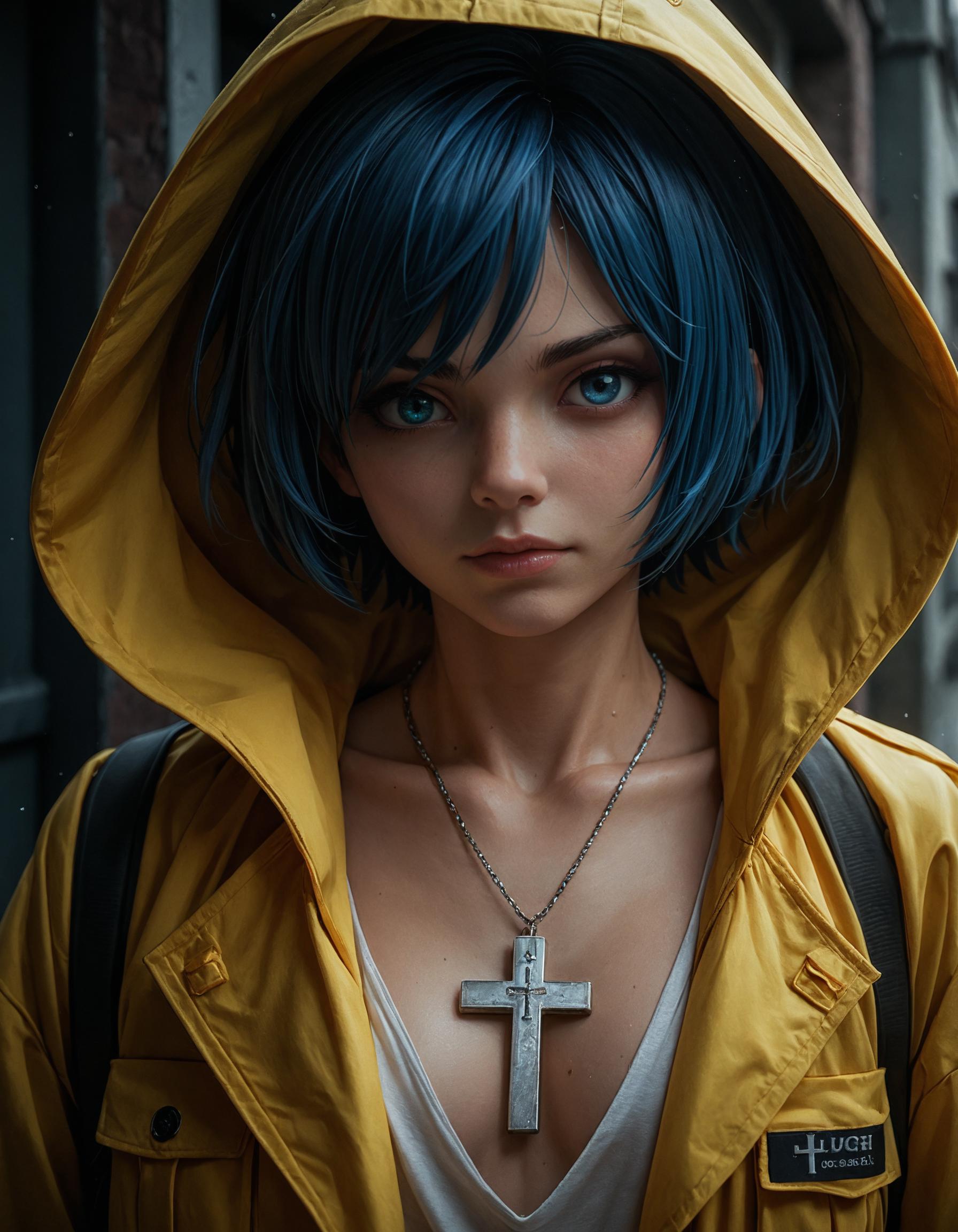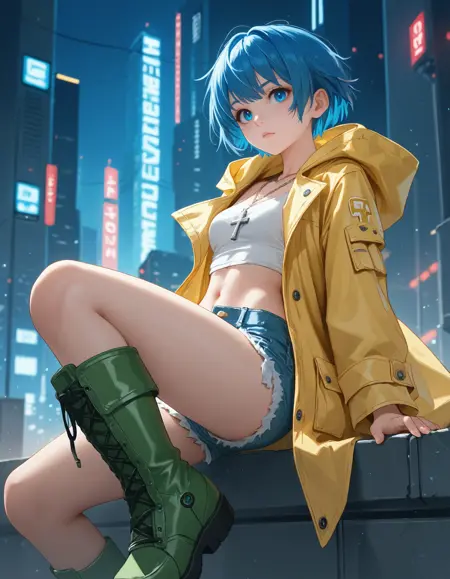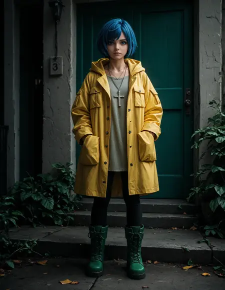 luc3, 1girl, blue hair, short hair, blue eyes, cross necklace, yellow raincoat, green boots