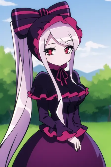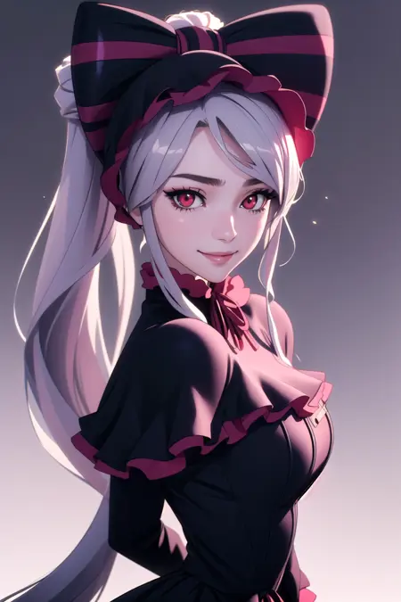 Outfit helpers: bonnet, hair bow, black dress, long sleeves,