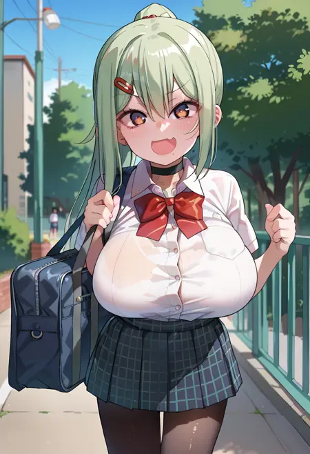 sorakomozu, brown eyes, black pupils, long hair, hairclip, huge breasts, short, short stature,