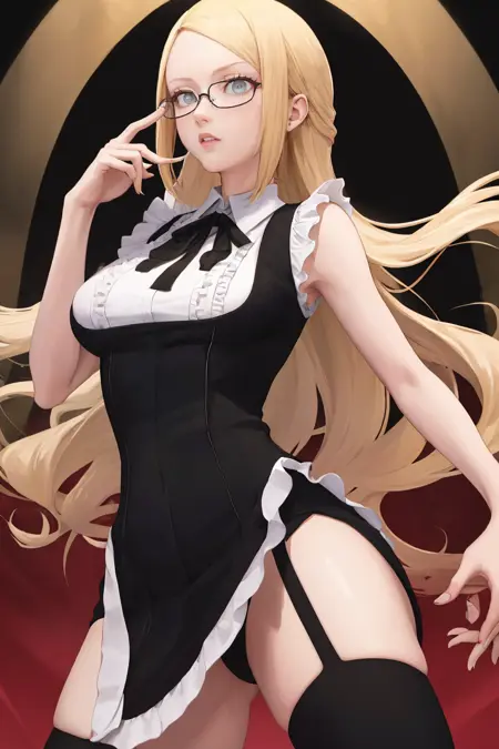 ドレス、フリル、ノースリーブ、メガネ、ブラックの太ももハイズ