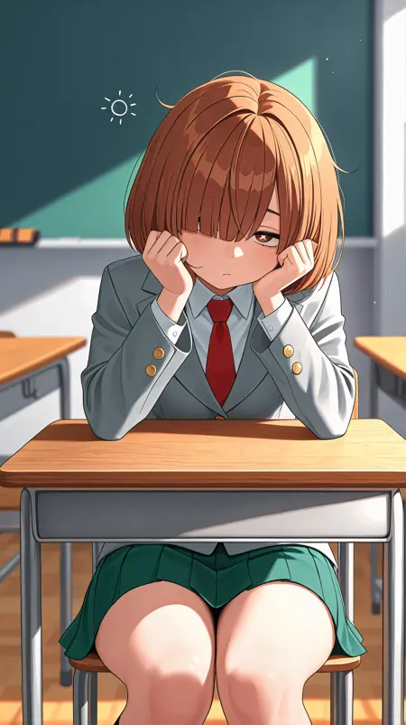 short hair, brown hair, bangs, hair covering one eye, brown eyes, grey school uniform jacket, school uniform, white collared shirt, red necktie, green skirt, pleated skirt, susuit4,