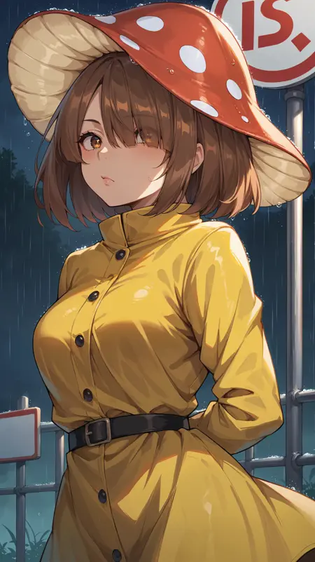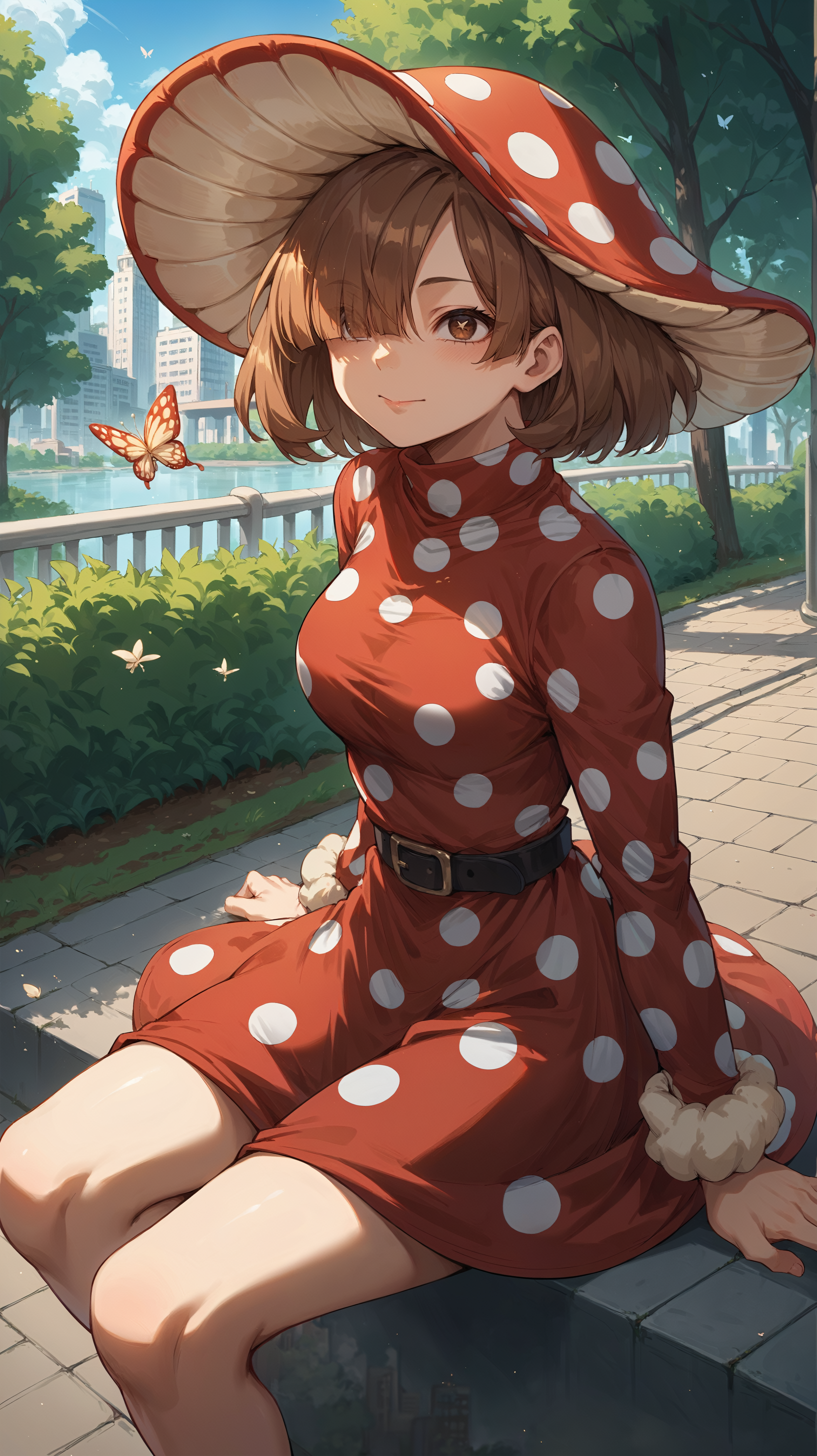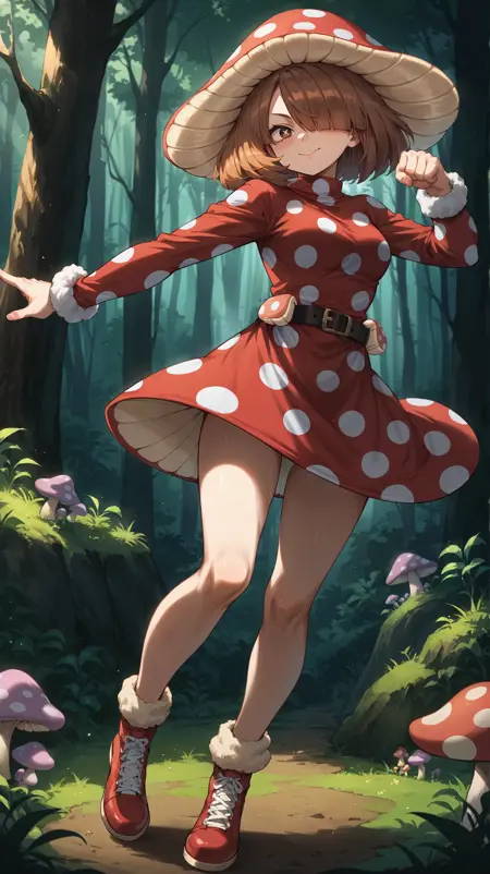 short hair, brown hair, bangs, hair covering one eye, brown eyes, mushroom cap hat, red polka dot dress, black belt, hsuit1,