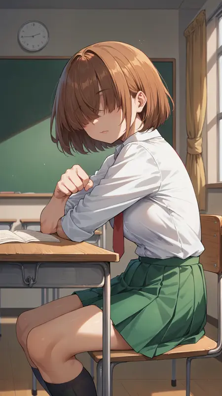 short hair, brown hair, bangs, hair covering one eye, brown eyes, grey school uniform jacket, school uniform, white collared shirt, red necktie, green skirt, pleated skirt, susuit4,