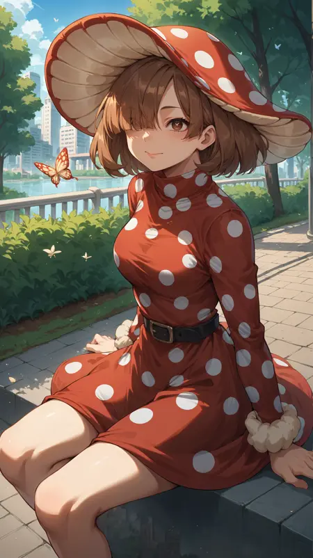 short hair, brown hair, bangs, hair covering one eye, brown eyes, mushroom cap hat, red polka dot dress, black belt, hsuit1,