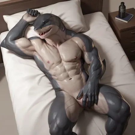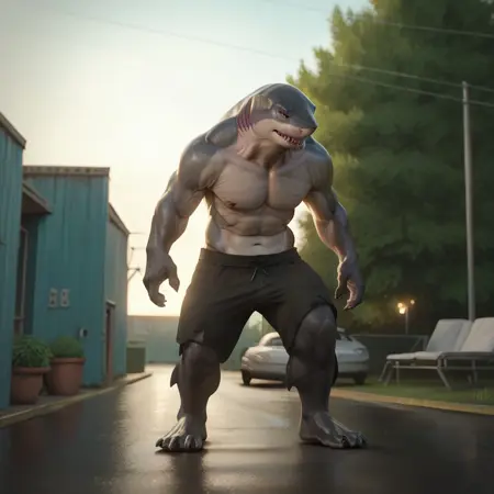 kingsharkf, anthro, male, shark, grey skin, torn pants,