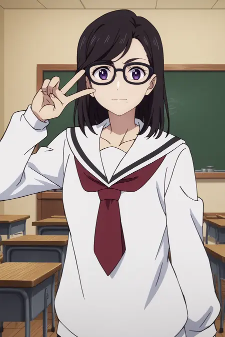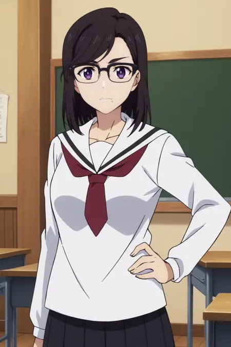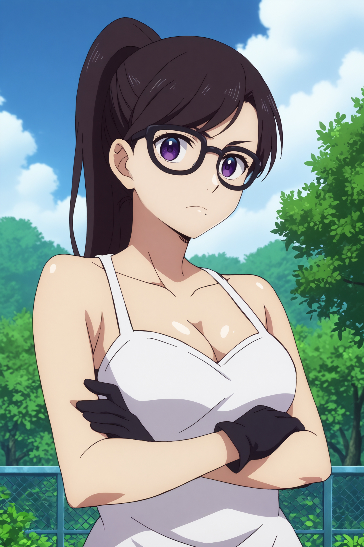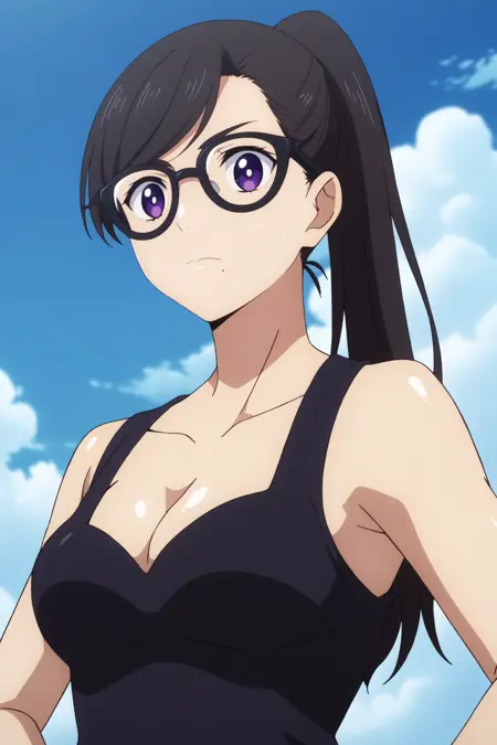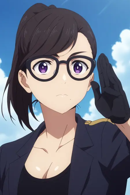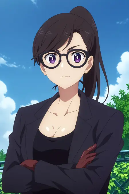 트리거: hizuru minakata,1girl,solo,glasses,breasts,cleavage,gloves,ponytail,mole under mouth,long_hair,looking at viewer,black-framed eyewear,bangs