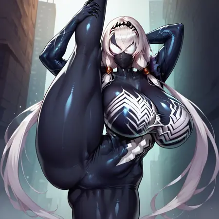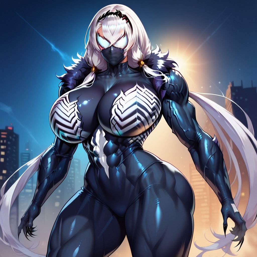 PersephoneSym, 1girl, 흰색 머리카락, 낮은 트윈테일, 매우 긴 머리카락, 십자 뱅, 거대한 가슴, 넓은 어깨, 넓은 엉덩이, 가는 허리, 극도로 근육질, 근육질 여자, 샤프한 몸매, 검은 피부, 몬스터 걸, 심비오티, 흰색 눈, 동공 없음, 흰색 몸 패턴, 얼굴 특징 없음, 입 없음, 특징 없는 가슴, 검은 발톱, 심비오티,