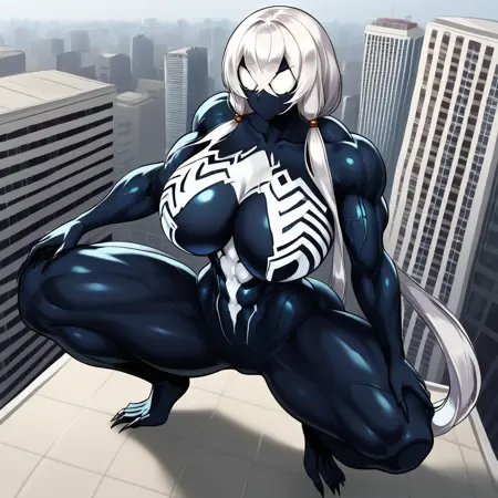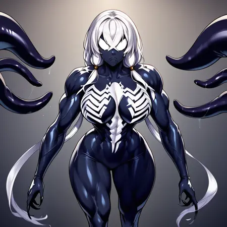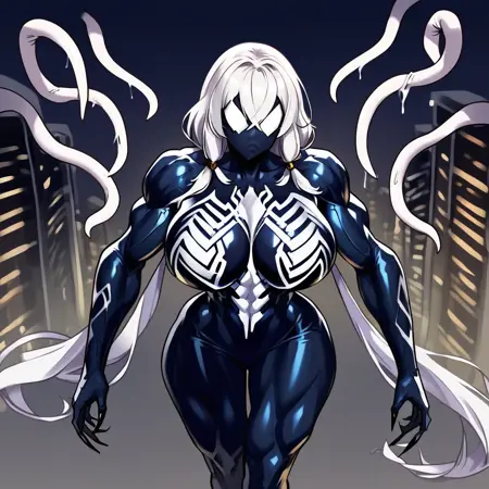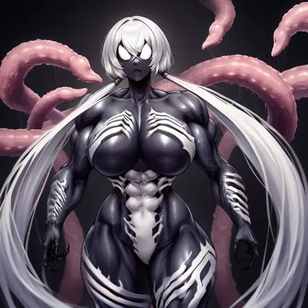 PersephoneSym, 1girl, 白髪, 低いツインテール, 非常に長い髪, 交差した前髪, 大きな胸, 広い肩, 広い hips, 細いウエスト, 筋肉質, 筋肉質な女性, タイムグラス体型, 黒い肌, モンスター娘, シンビオート, 白い目, 瞳なし, 白い体の模様, 特徴のない顔, 口なし, 特徴のない胸, 黒い爪, シンビオート,
