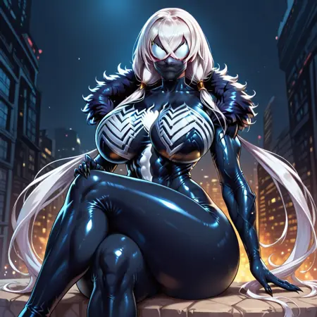 PersephoneSym, 1girl, 흰색 머리카락, 낮은 트윈테일, 매우 긴 머리카락, 십자 뱅, 거대한 가슴, 넓은 어깨, 넓은 엉덩이, 가는 허리, 극도로 근육질, 근육질 여자, 샤프한 몸매, 검은 피부, 몬스터 걸, 심비오티, 흰색 눈, 동공 없음, 흰색 몸 패턴, 얼굴 특징 없음, 입 없음, 특징 없는 가슴, 검은 발톱, 심비오티,