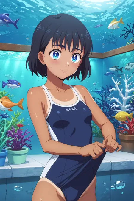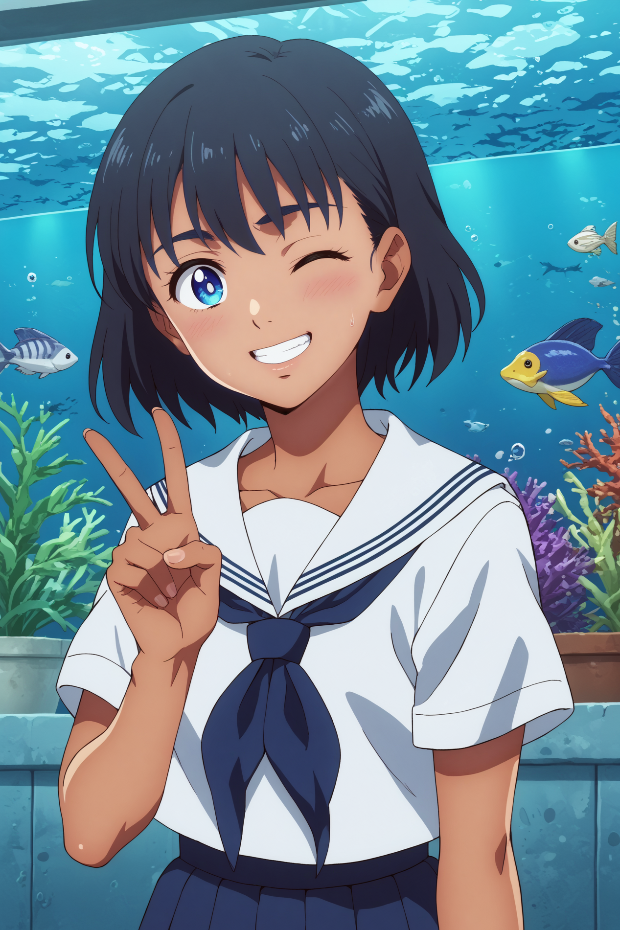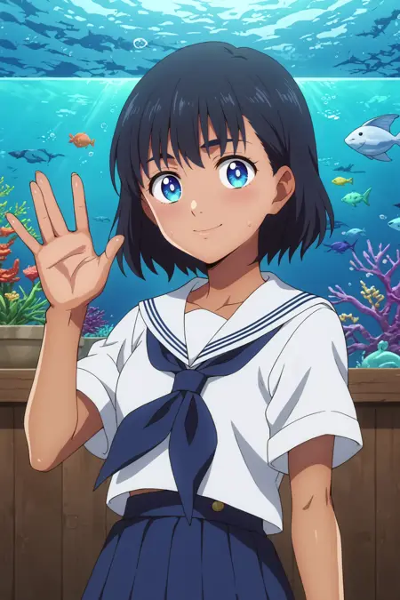 트리거: mio kofune, 1girl, solo, short hair, school uniform, shirt, serafuku, dark skin, dark-skinned female, white shirt, closed mouth, skirt, white sailor collar
