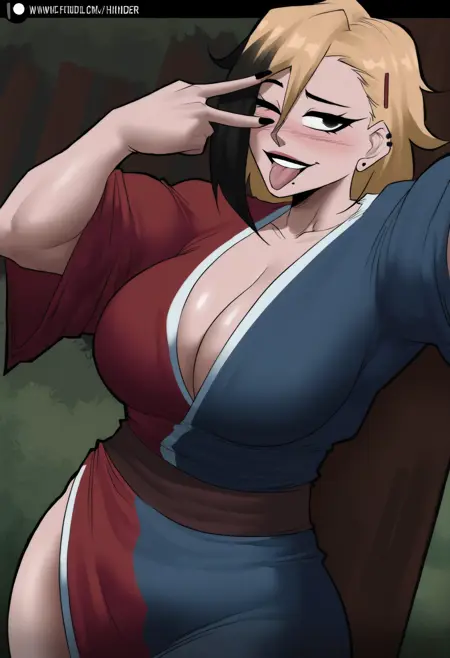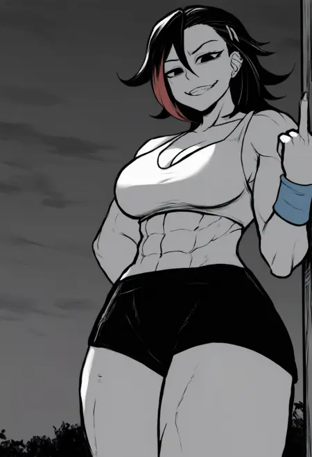외모 태그: 검은 머리카락, 머리핀, 귀 천공, 큰 가슴, 근육질의 여성, 복근, 두꺼운 허벅지
