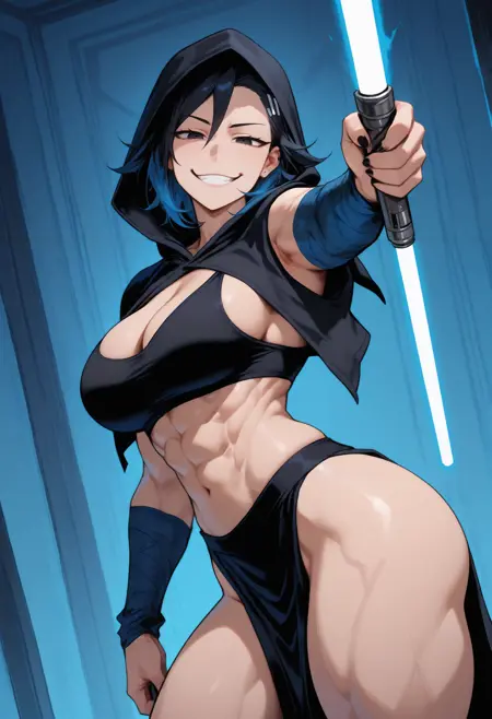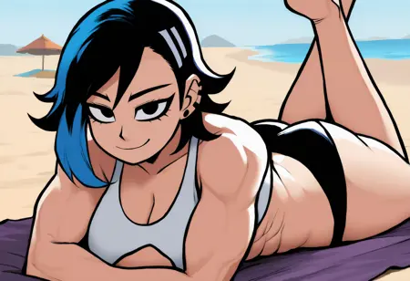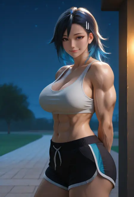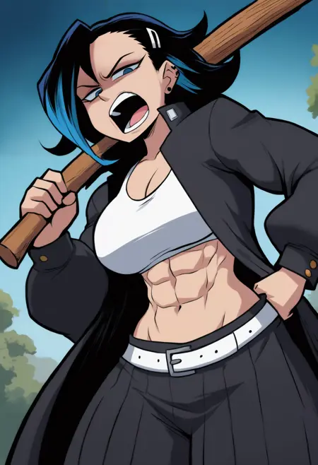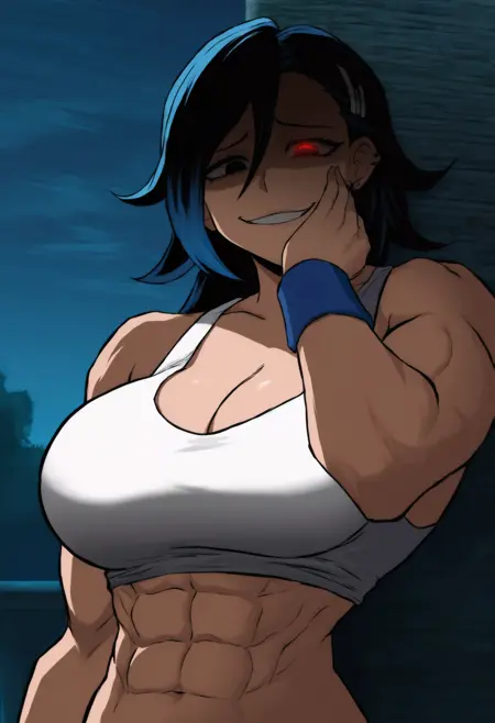 외모 태그: 다색 머리카락, 검은 머리카락, 파란 머리카락, 검은 눈, 큰 가슴, 근육질의 여성, 복근, 두꺼운 허벅지