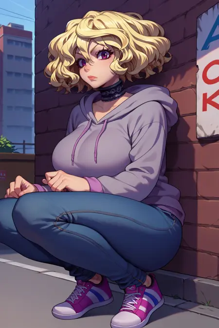 트리거 단어는 "mski"이며, "금발 머리, 짧은 머리, 파마 머리, 보라색 눈"이 필수입니다.