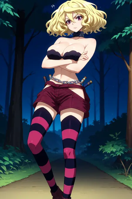 Add "black choker, black bra, chain, maroon shorts, short shorts, striped thighhighs" for her typical look.