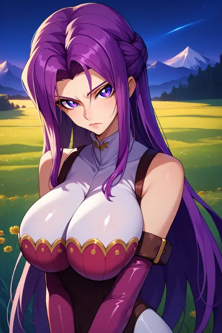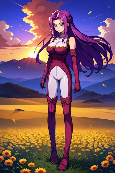 2시즌 외모를 원한다면 "cgCor, 보라색 머리, 긴 머리, 왕관 땋기, 보라색 눈, 흰색 바디슈트, 보라색 버스티어, 소매 없음, 팔 드러냄, 팔꿈치 장갑, 보라색 장갑, 보라색 허벅지 부츠"를 추가하세요.
