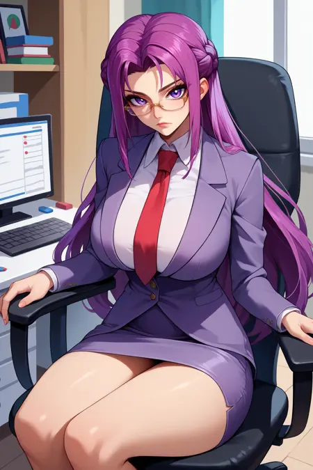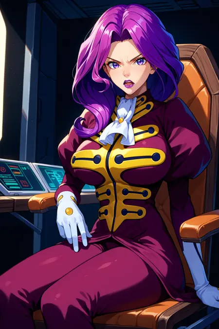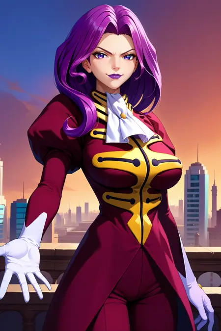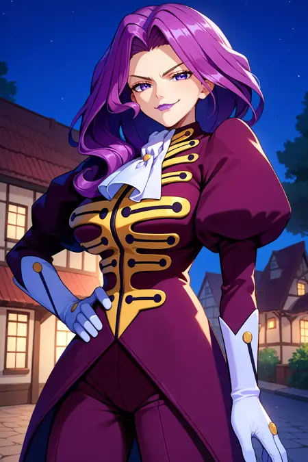 1시즌 외모를 원한다면 "cgCor, 보라색 머리, 긴 머리, 파마 머리, 보라색 눈, 보라색 립스틱, 흰색 애스콧, 자홍색 유니폼, 군복, 풍성한 소매, 긴 소매, 흰색 장갑, 자홍색 바지"를 추가하세요.