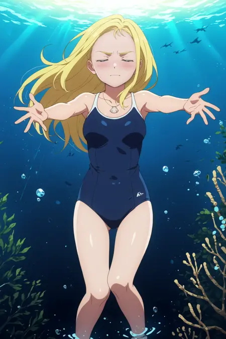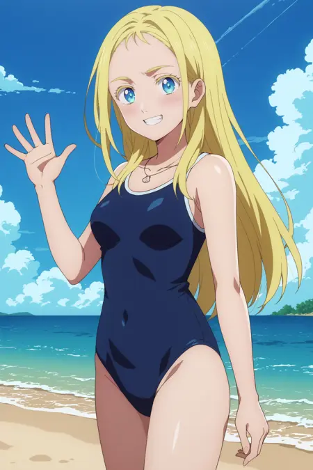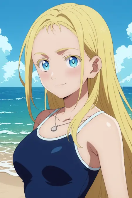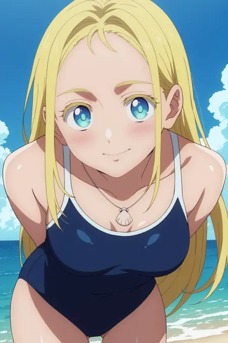 トリガー:ushio kofune,1girl,solo,long hair,looking at viewer,shell necklace,blue one-piece swimsuit,breasts,competition school swimsuit,school swimsuit