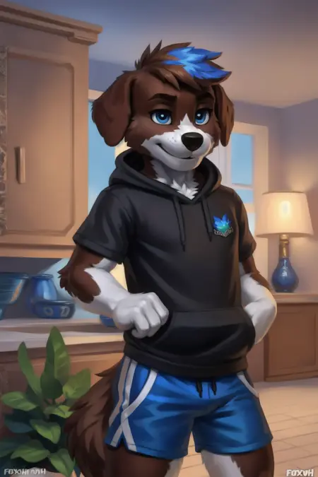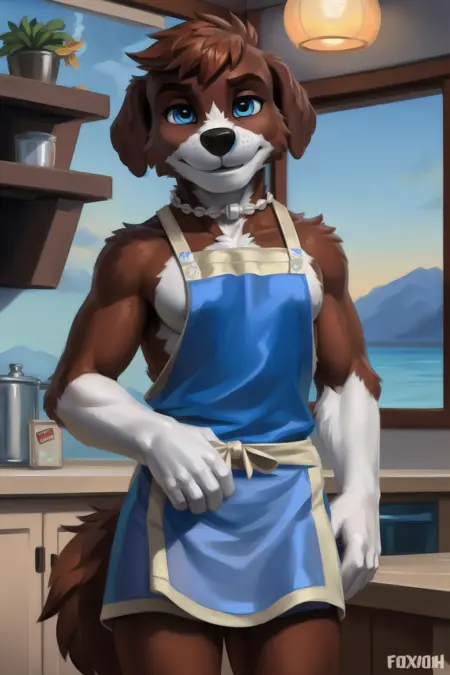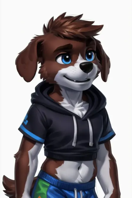 强化提示:“家养狗,雄性,蓝色眼睛,棕色毛发,白色身体”