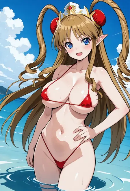 neigehausen, pointy ears, red bun cover, drill locks, very long hair, twin drills,, crown, brown hair, large breasts,