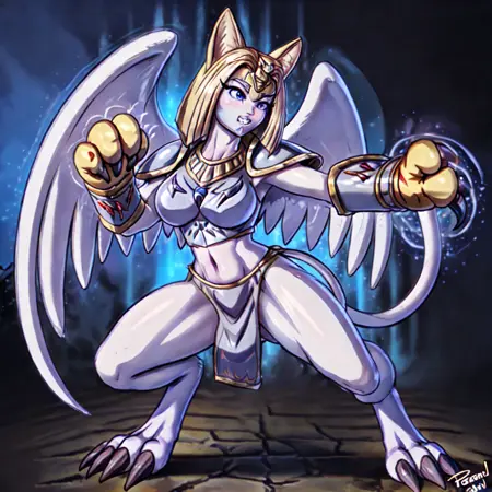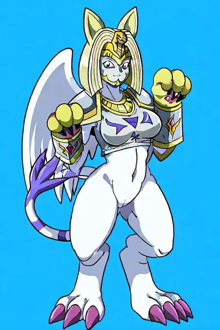 디지몬 네페르티몬을 재현하려는 LoRA로, 원래 디자인에 가깝게 또는 앤트로 스타일로 만들 수 있습니다.