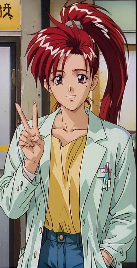 reikoaod, 1girl, red hair, solo, long hair, 1990s (style), retro artstyle, ponytail, long sleeves, labcoat, , looking at viewer