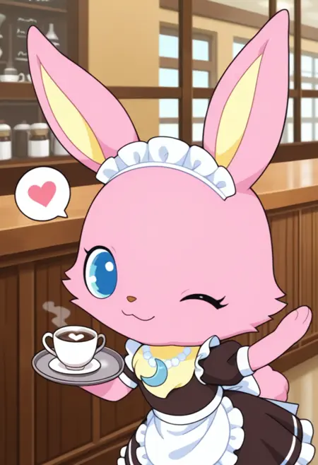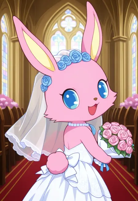 プロンプト: lunajp, ジュエリー, 青い目, ネックレス, 人間なし, ファリー, チビ, 黄色い胸毛, 頭部アクセサリー, 尾, 兎, ピンクの毛