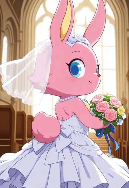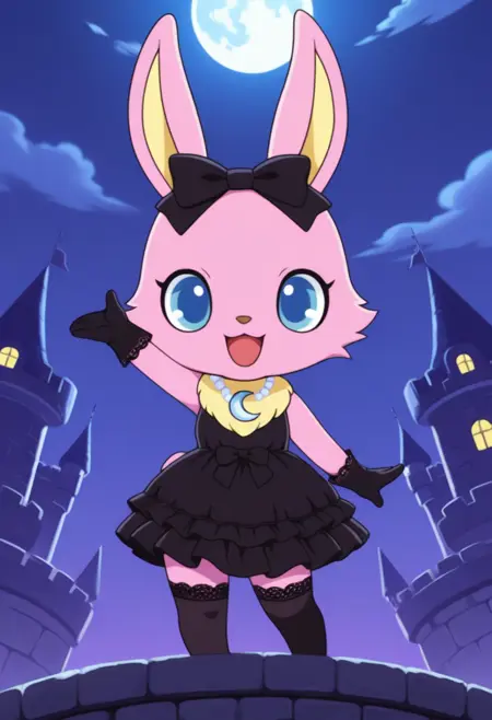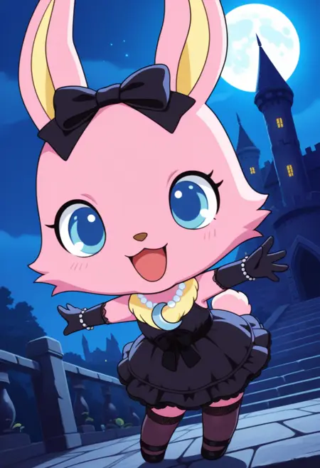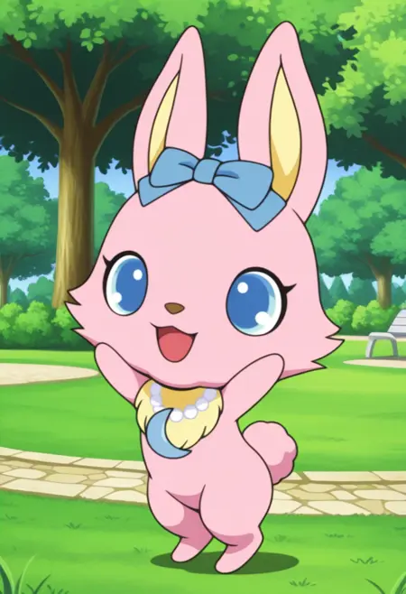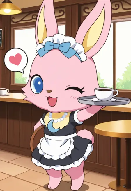 Prompts: lunajp, jewelry, blue eyes, necklace, no humans, furry, chibi, yellow chest fur, head accessory, tail, rabbit, pink fur