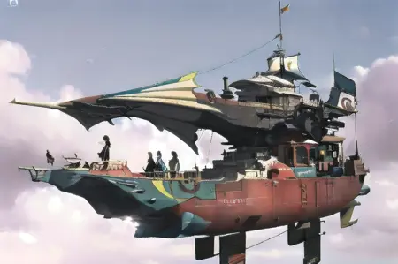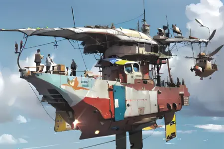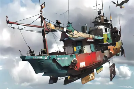 일반적인 프롬프트 단어: vehicle focus, aircraft, ship, watercraft, scenery, bird, airship, military, flying, boat, Flying boat, science fiction, robot, mecha, city, multiple boys, radio antenna, military, building, realistic, machinery, aircraft