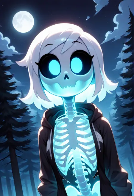 English: Trained on images of glowing skeleton ghosts with translucent bodies.