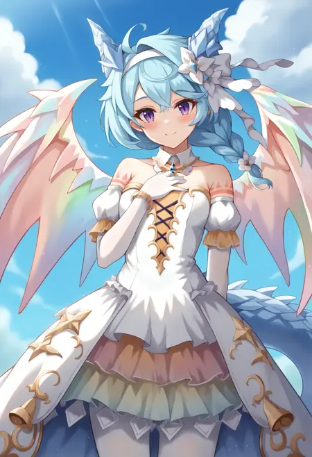 - sffypform, white dress, hair flower, multicolored wings, rainbow wings, white hairband, cross-laced dress, detached collar, jewelry, bare shoulders, puffy sleeves, strapless, see-through cutout, detached sleeves, elbow gloves, gold trim, overskirt, multicolored skirt, rainbow skirt, frills, white pantyhose,