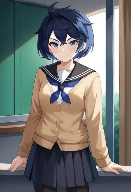 rlsheffy, dark blue hair, short hair, ahoge, blue eyes,