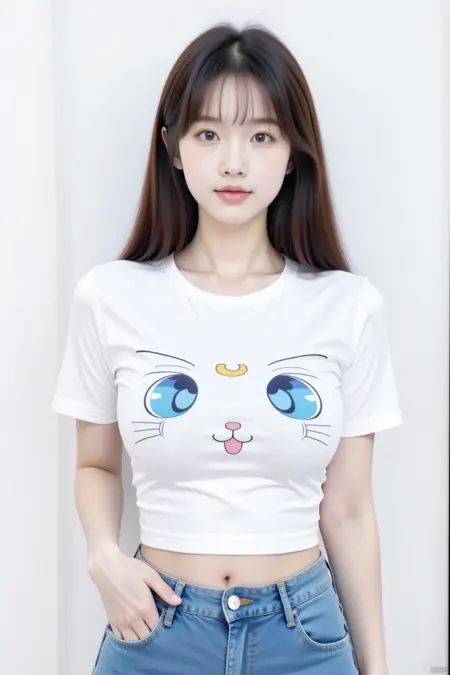 - 推奨:インフルエンサー衣装、若いアジア系女性が白い壁の前に立っている。彼女は白いTシャツを着ており、前面には猫の顔が描かれている。 猫の顔は青い目、ピンクの舌、黄色い笑顔で装飾されており、彼女の髪は長く、肩を伝って流れ、衣装に彩りを加えている。 背景は真っ白