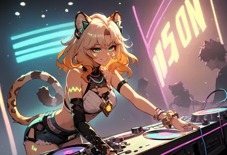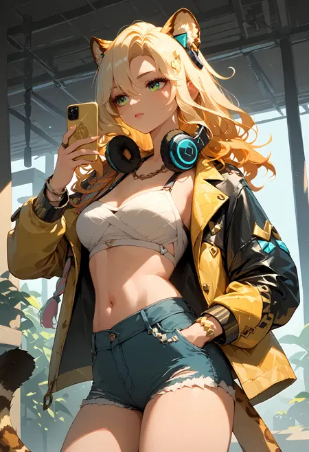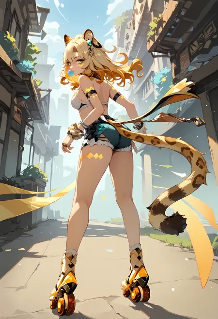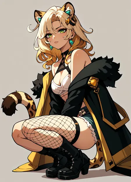 触发词:xilonen, leopard tail, necklace, open clothes, single detached sleeve, bracelet, thigh tattoo, toeless heels