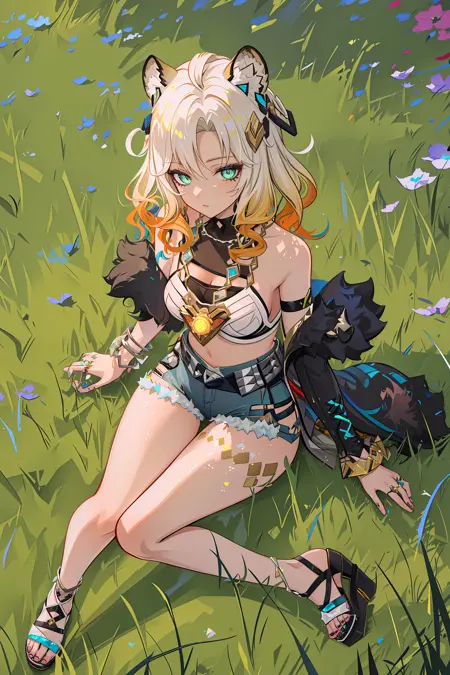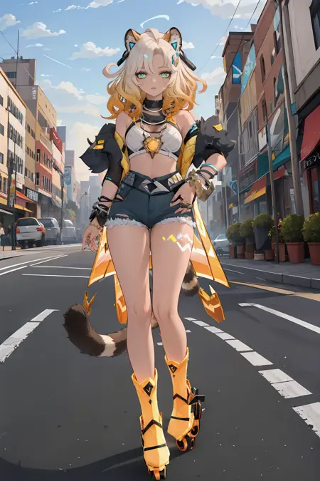 트리거 단어: xilonen, 표범 꼬리, 목걸이, 열린 옷, 한쪽만 떨어진 소매, 팔찌, 허벅지 타투, 발가락이 드러난 힐