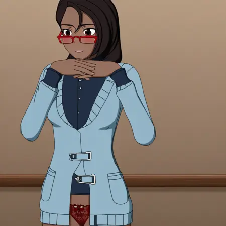 1girl, dark skin, brown eyes, short brown hair, red glasses, dark grey pants, navy blue shirt, light blue sweater, red shoes
