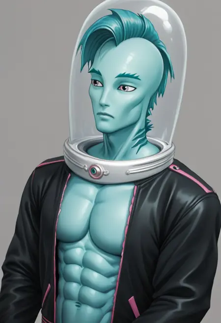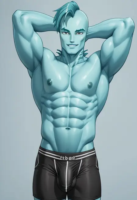 吉尔·韦伯 G1,蓝色皮肤,鱼人,海怪,腹肌,白色虹膜,鱼鳃,深青色鳍状头发,莫霍克发型,尖锐的颧骨,男性