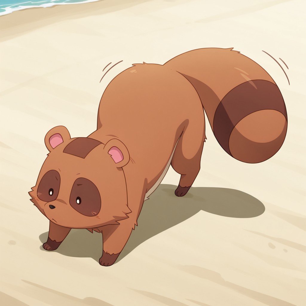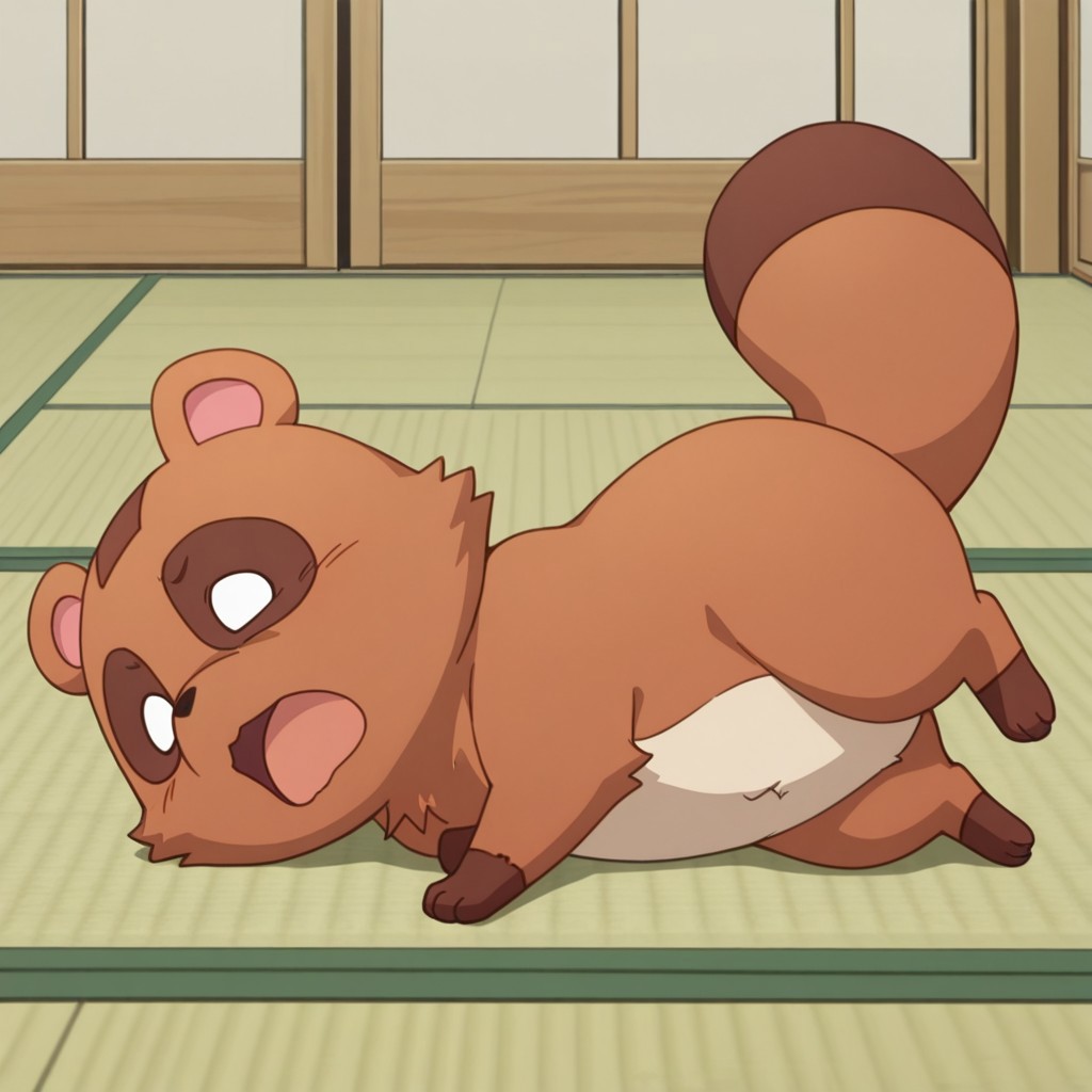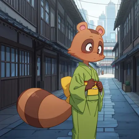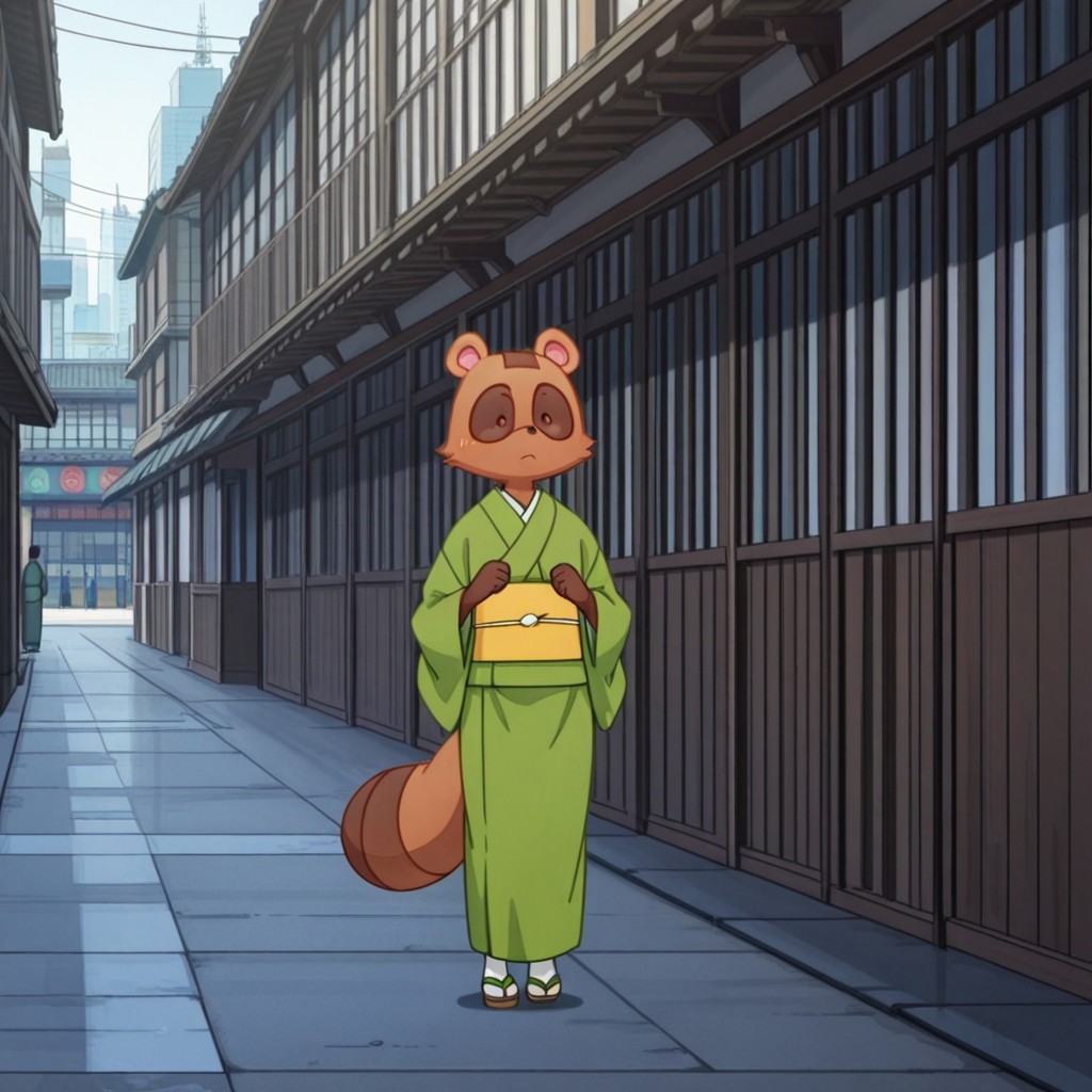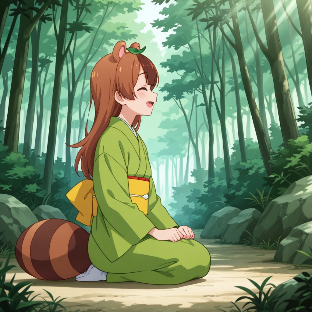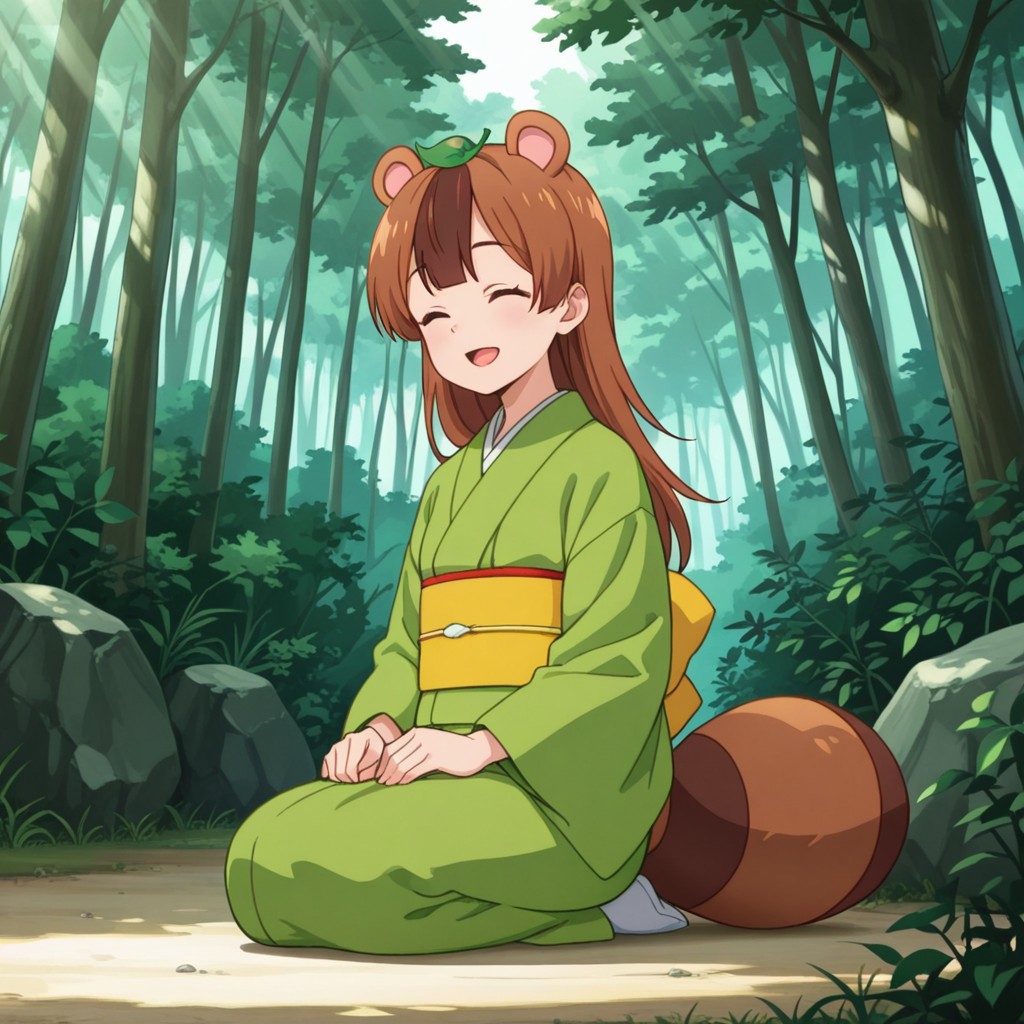 mamedatanIL, human, female, brown hair, brown eyes, green kimono, raccoon tail, raccoon ears, leaf on head,
