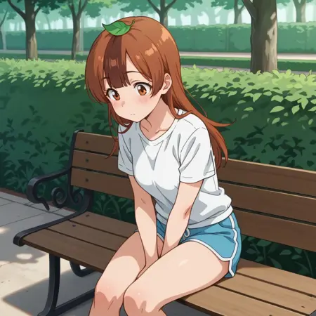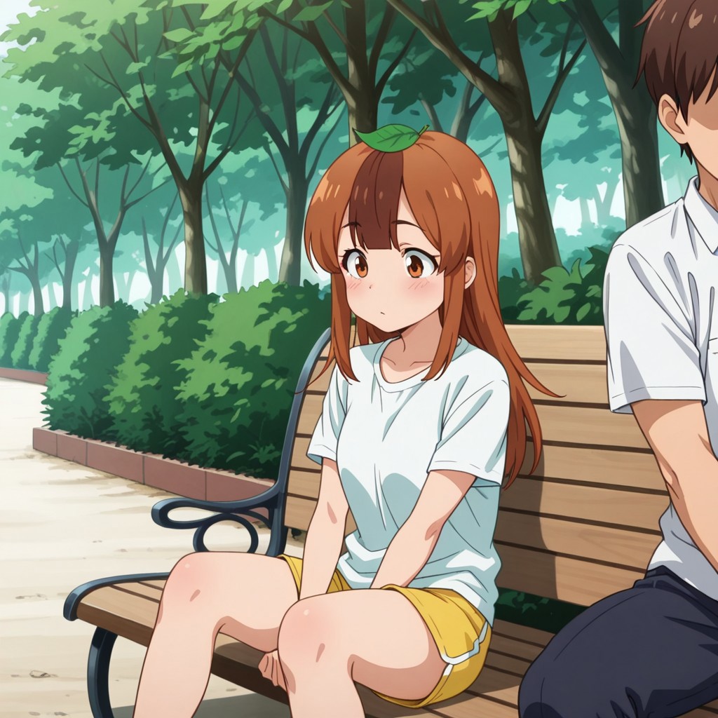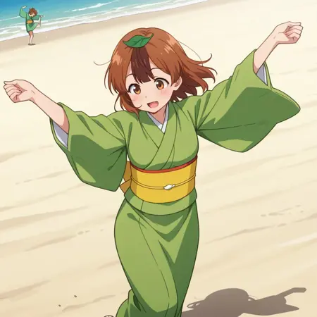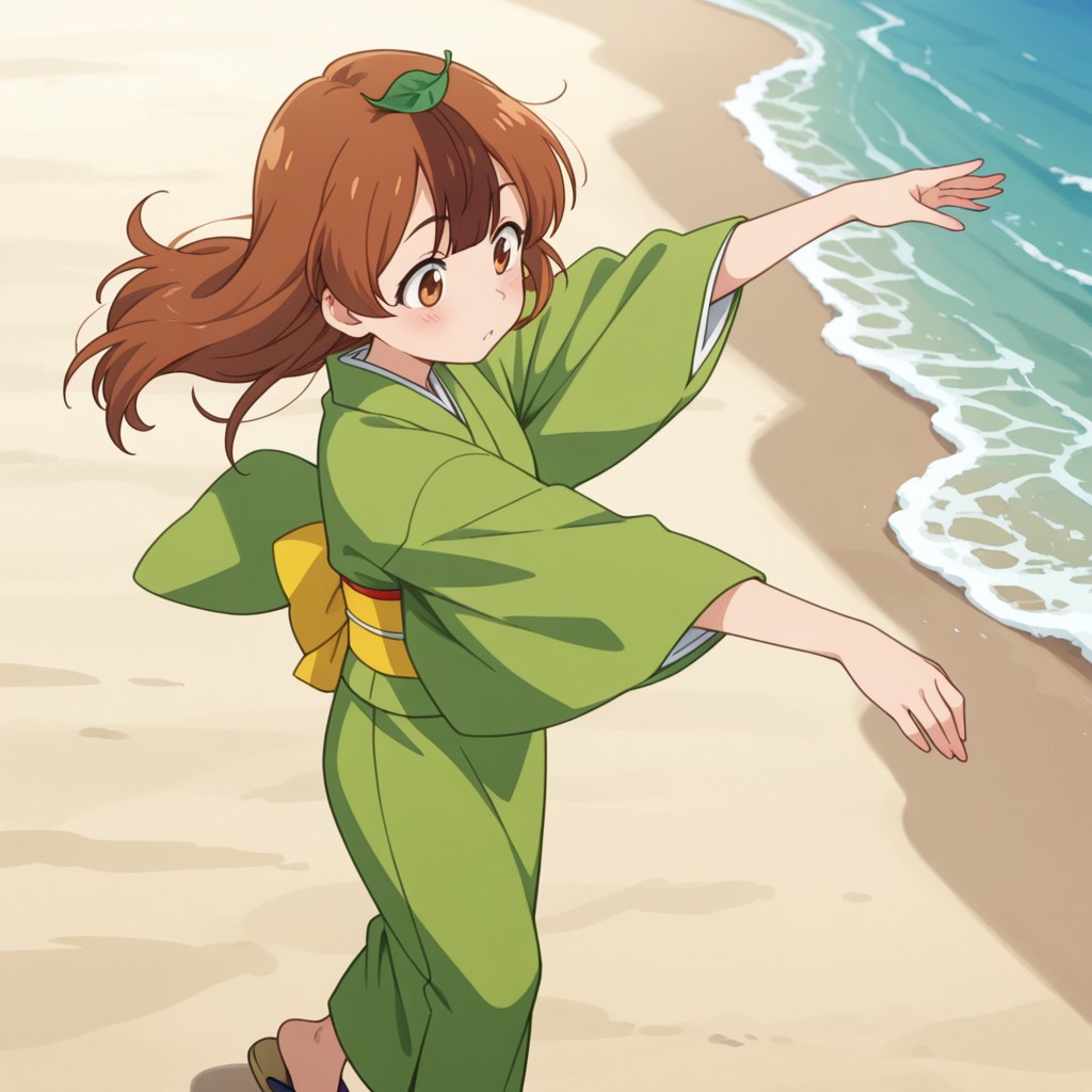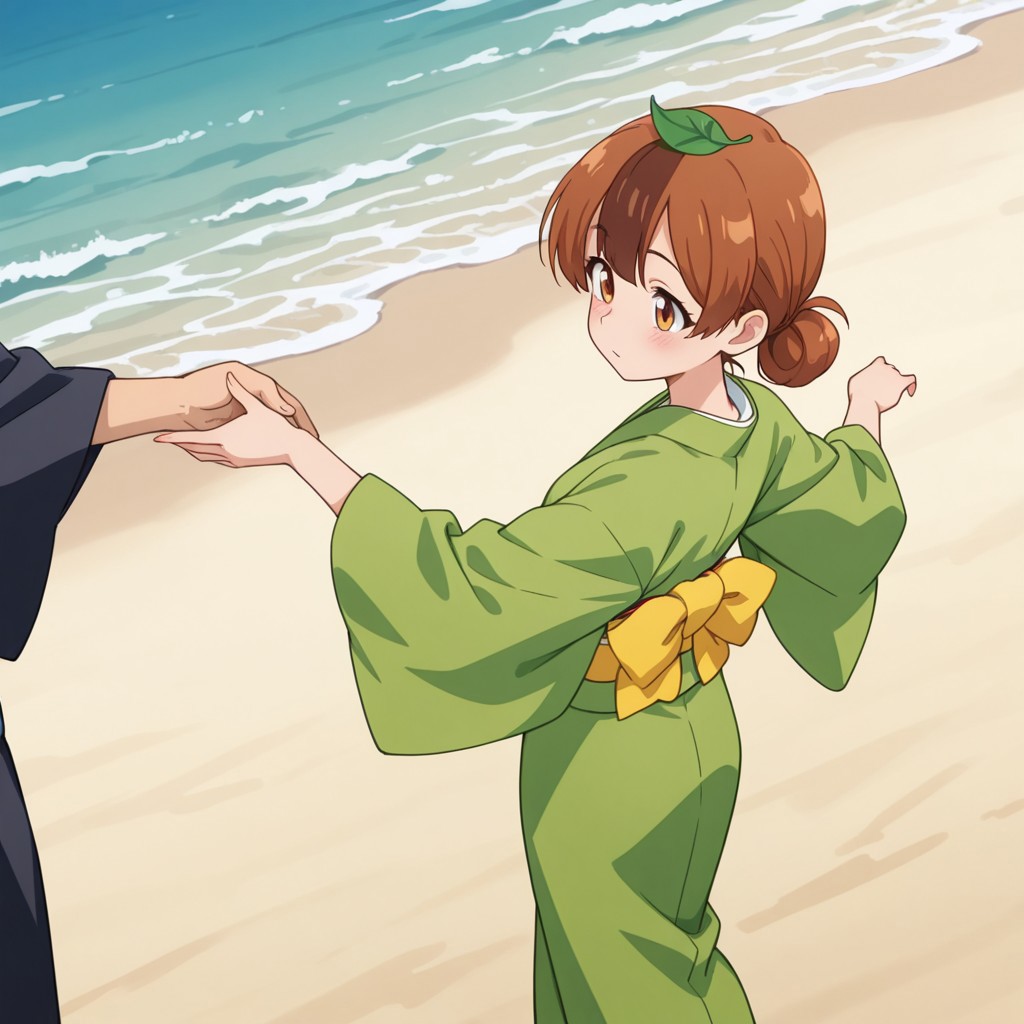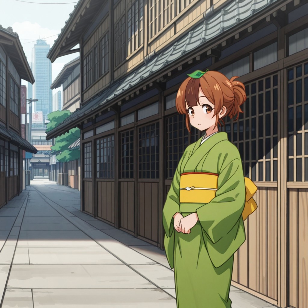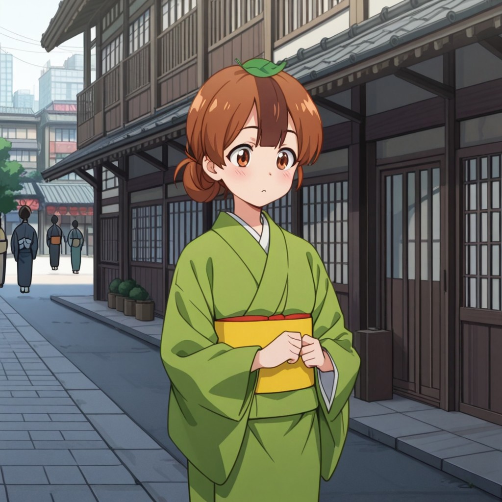 mamedatanIL, human, female, brown hair, brown eyes, leaf on head, green kimono,