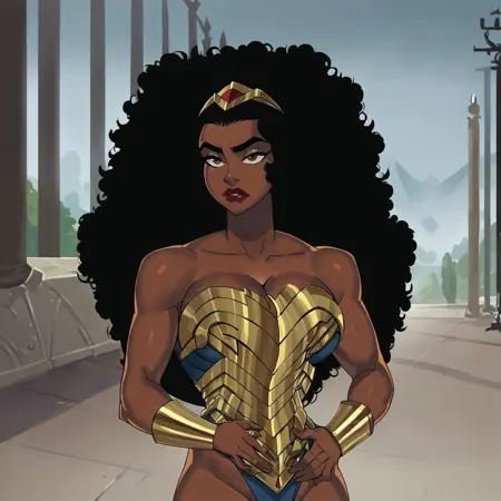 black hair, long hair, afro, big hair, very dark skin, brown eyes, makeup, lipstick, armor, leotard, bracers, tiara, cleavage, nubia