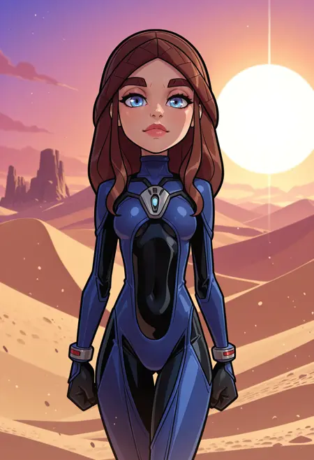 recommended tags: 1girl, solo, Alia Atreides, brown hair, long hair, blue eyes, bodysuit,