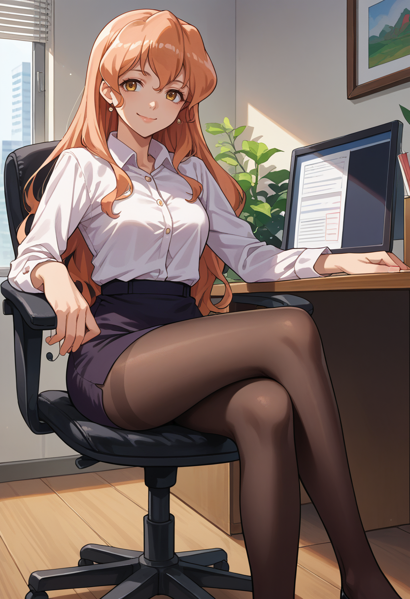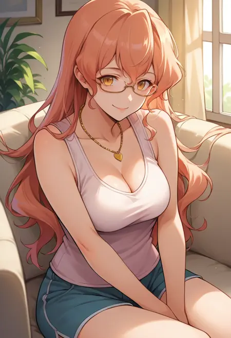 Muginami,黄色眼睛,粉色头发,长发,耳罩,白色项圈,黑色背心,白色腰带,红色裙子,皮草镶边夹克,白色夹克