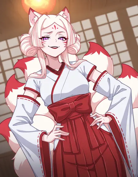 프롬프트: High-Priestess-Kumiko, 흰색 단발, 동물 귀, 빨간 메이크업, 흰색 기모노, 빨간 하카마, 보라색 눈, 여섯 개의 꼬리, 갈색 립스틱.