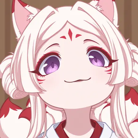 프롬프트: High_Priestess_Kumiko, 흰색 머리, 동물 귀, 빨간 메이크업, 여우 꼬리, 흰색 기모노, 빨간 하카마, 보라색 눈, 갈색 립스틱.