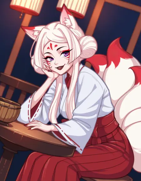 提示词: High-Priestess-Kumiko,白色短发,动物耳朵,红色妆容,白色和服,红色袴,紫色眼睛,六条尾巴,棕色唇膏。
