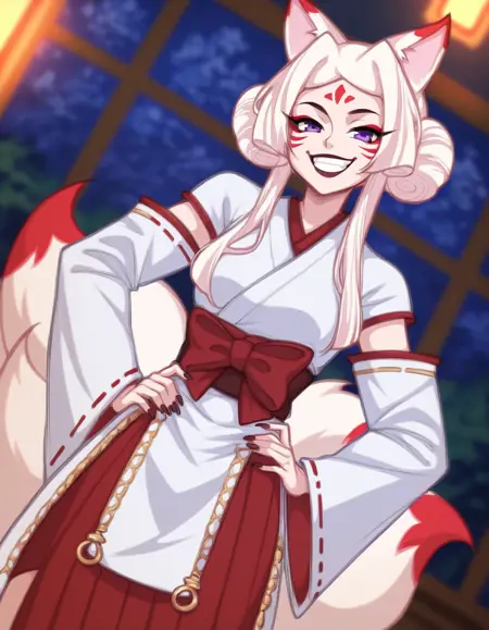 Promt: High-Priestess-Kumiko, white short hair, animal ears, red makeup, white kimono, red hakama, purple eyes, six tail, brown lipstick.