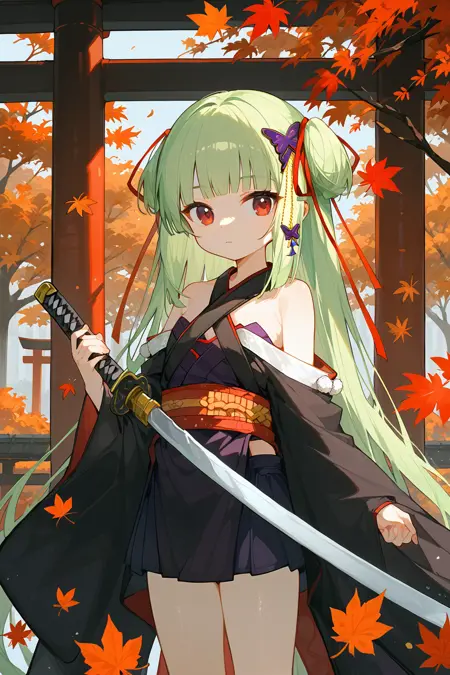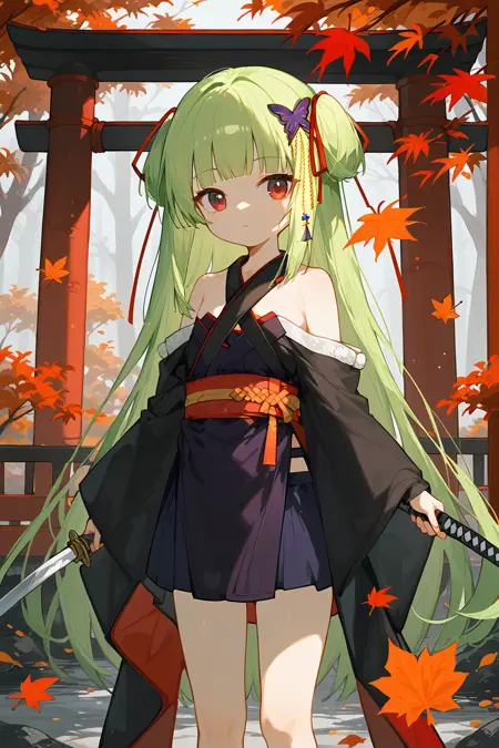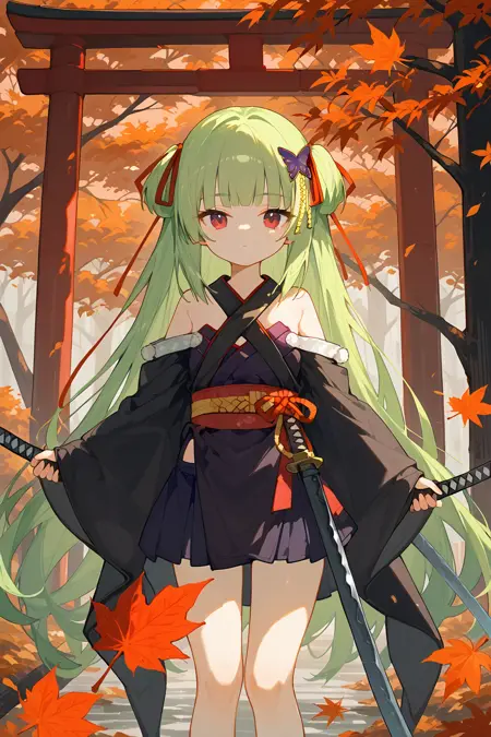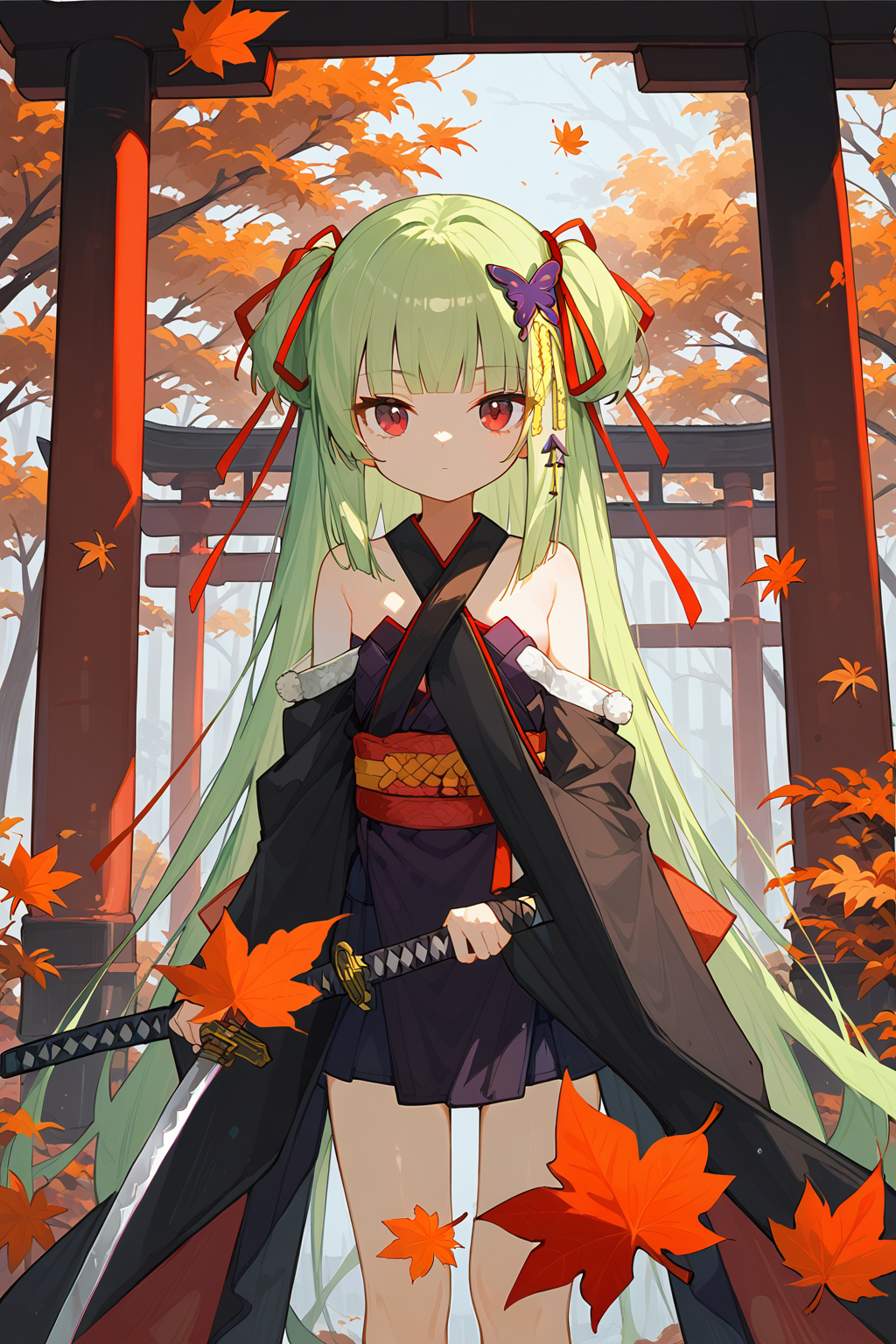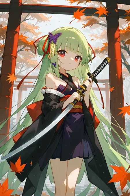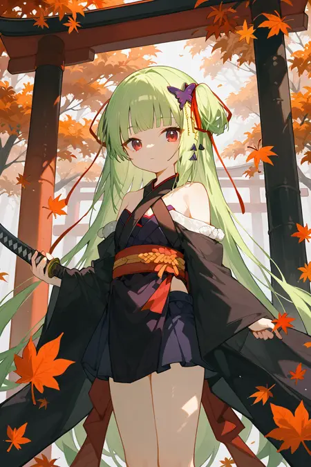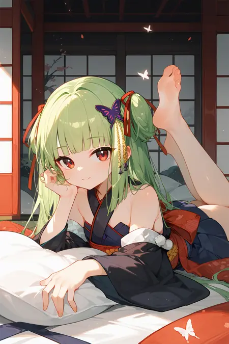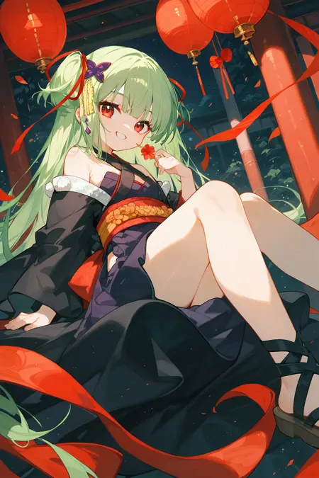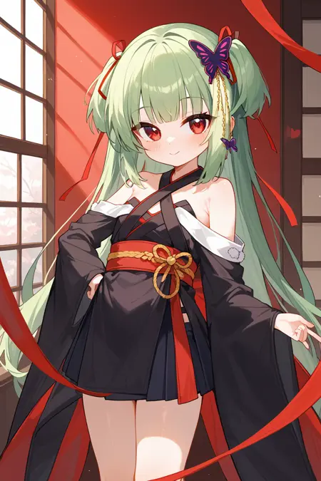 congyu(Senren*Banka),1girl,solo,long hair,green hair,hair ornament,butterfly hair ornament,japanese clothes,hair ribbon,ribbon,bare shoulders,very long hair,hand on hip,detached sleeves,skirt,red eyes,smile,sash,