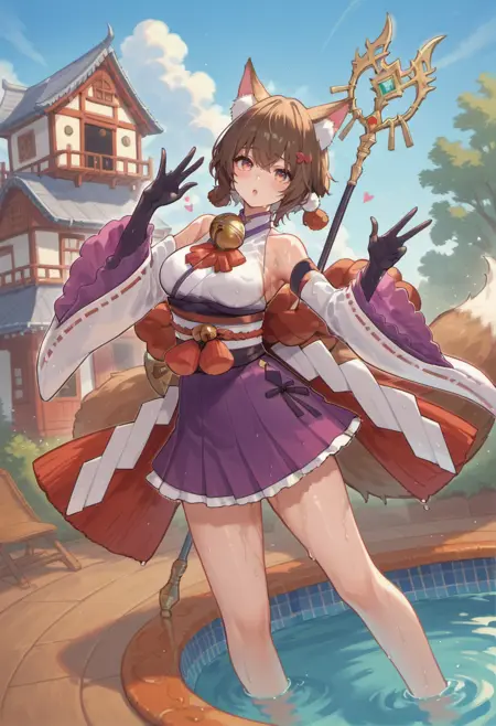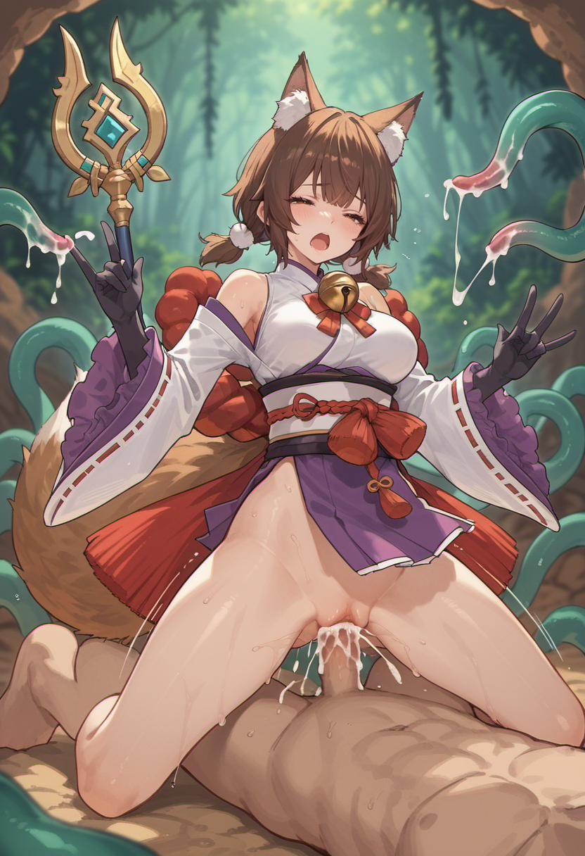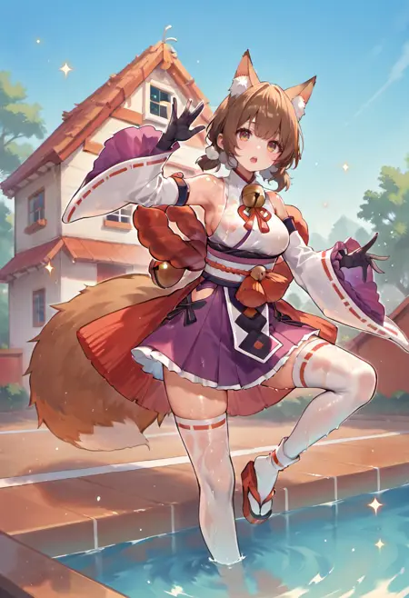 yukumo,茶色の髪,狐の尾,動物の耳のフリル,動物の耳,黒い手袋,手袋,鈴,わーく,(和服),長袖の着物,白い片足ロングタイツ